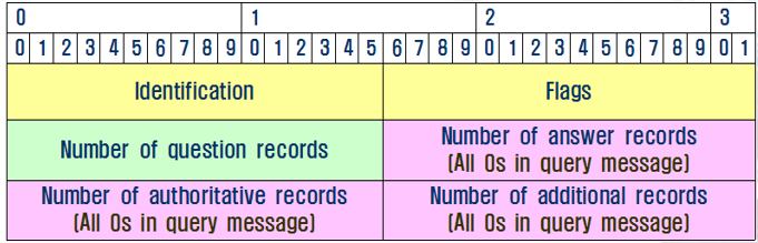 - 질의와 응답 메시지는 모두 같은 헤더 형태를 가지며 질의 메시지의 경우 몇 개의 필드는 0으로 지정