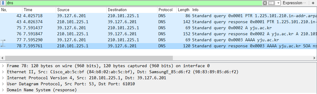 Wire Shark를 켜고 DNS서버에 접속해 패킷을 캡처 및 분석 해보자.