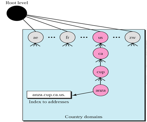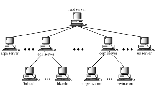 - 이러한 문제점의 해결책은 정보들을 DNS 서버라는 많은 컴퓨터에 분산시키는 것으로 모든 공간을 첫 번째 레벨에 기초하여 많은 도메인으로 나누는 방법이 있음