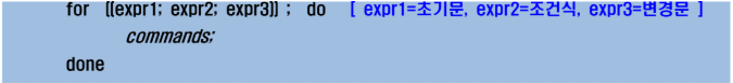 쉘형식의 for문과 C언어 형식의 for문으로 나눌 수 있다.